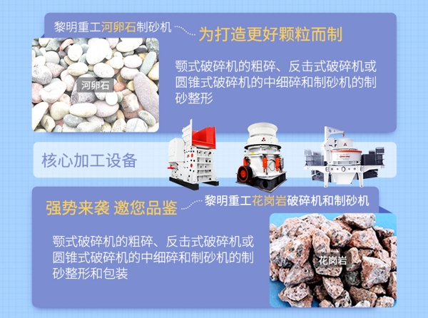首先河卵石原料先由顎式破碎機(jī)進(jìn)行粗碎處理,將大石塊的河卵石破碎成小石塊,達(dá)到中、細(xì)碎入料要求即可。然后將顎式破碎機(jī)成品輸送至圓錐破碎機(jī)或反擊破碎機(jī)中進(jìn)行細(xì)碎處理,破碎成5公分左右的小石子,再用震動篩篩分后進(jìn)入下一道工序。